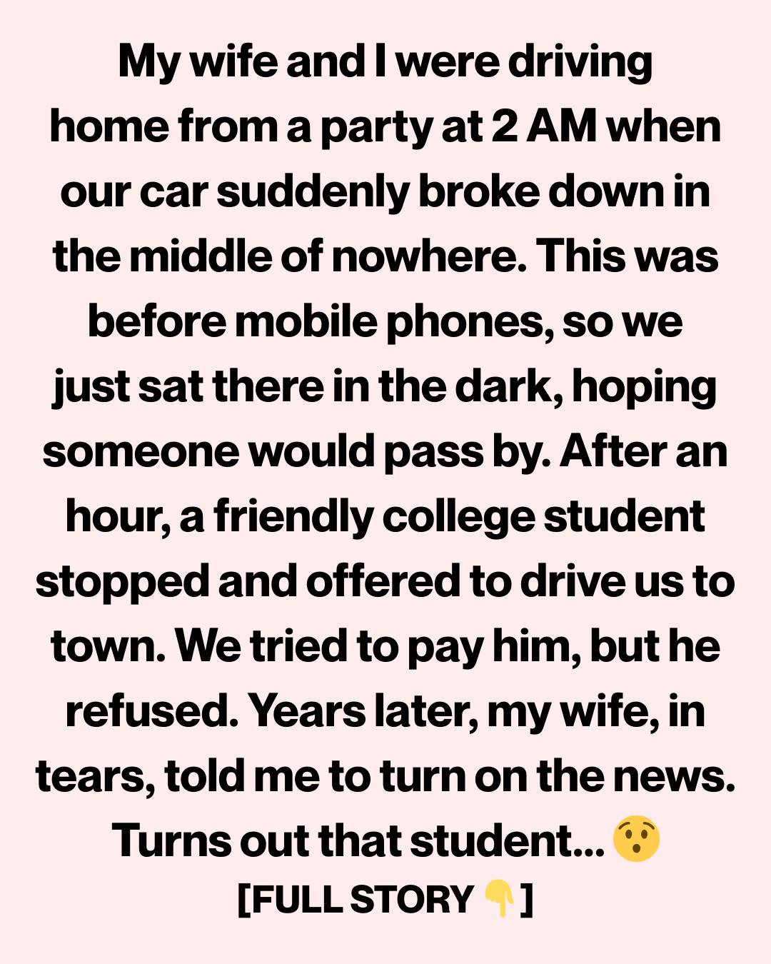 We sat there in the dark, windows cracked, listening to the wind brush through the grass. My wife wrapped her coat tighter around herself. I remember thinking how small we felt—two people in a broken car, miles from anywhere, with no idea how long we’d be waiting.